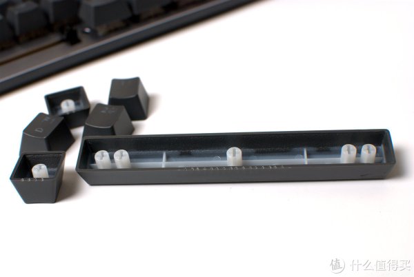 罗技k845键帽为ABS材质,通过两色注塑来实现透光效果,注塑方案采用了开口式字符设计,水口处理的不是非常完美,但是整体的透光效果比较自然。