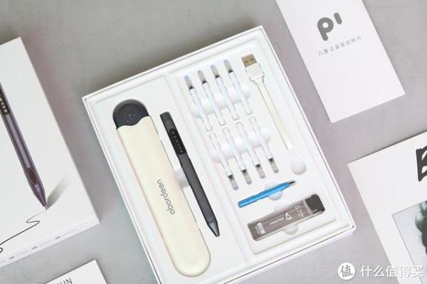 打开阿巴町儿童正姿笔的盒盖,正姿笔的全家福整整齐齐地映入眼帘。阿巴町儿童正姿笔"全家族"阵容豪华极了,有智能笔、充电盒、充电线、说明书等各1份,蓝色中性笔芯4支、黑色中性笔芯4支、铅笔头2支以及自动铅笔芯1盒,排序清晰明了,放在稳固的盒子里被紧紧包裹住,而且包装的盒子非常结实,即使快递物流的地方再远,也不用担心正姿笔会被磕碰坏了。
