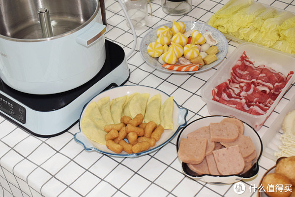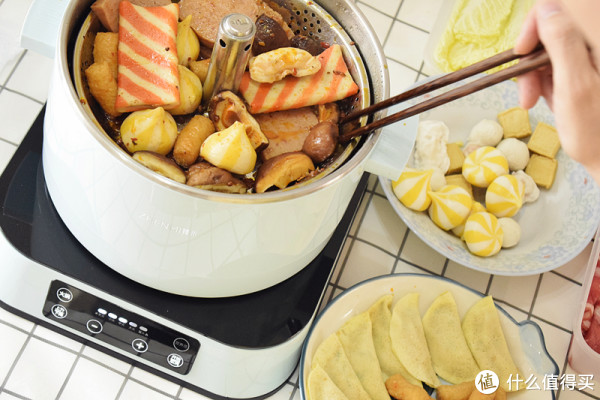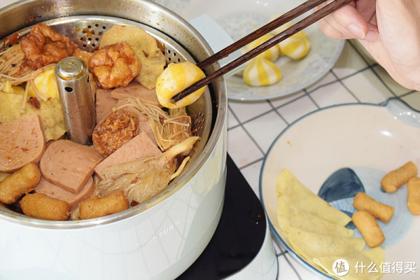 首先将买来/自制的火锅底料放入锅底,然后再将提篮盖在上面,这样可做到将底料与食材彻底分离。开启火锅模式后,锅底预热只需要八分钟左右,即可让其沸腾。然后我们就可以放入喜欢吃的各种羊肉卷、鱼丸蟹棒、豆皮火腿,以及各种青蔬,不说了,赶紧开吃: