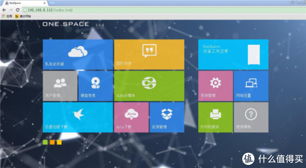 ONESPACE的用户界面简洁易懂,采用了类似metro风格的图标,一目了然,还可以点击左下方的的三个小方块来调整背景图。目前只有三个图案可选,希望后期能加入自定义背景图的功能。
