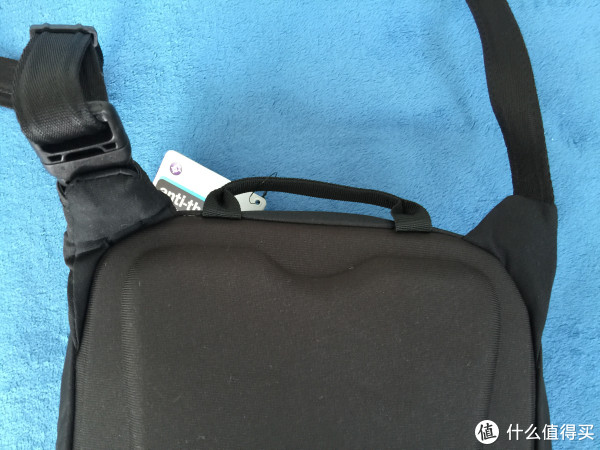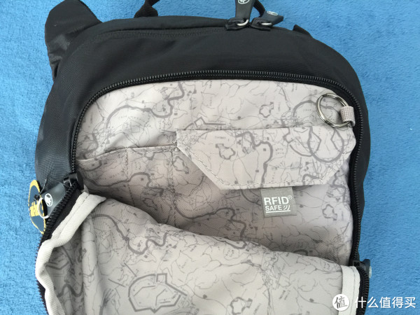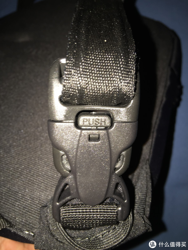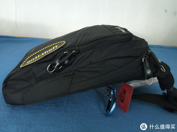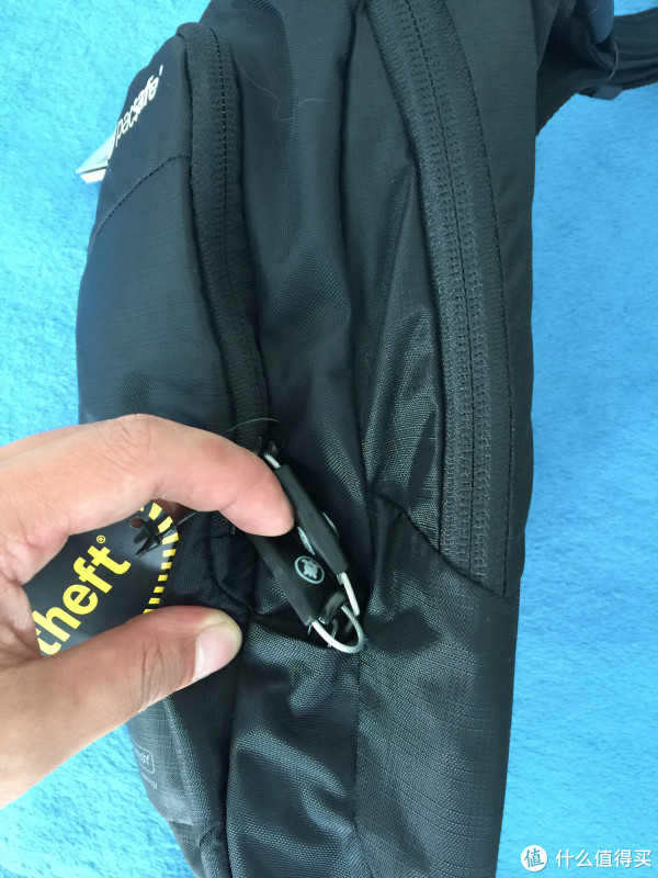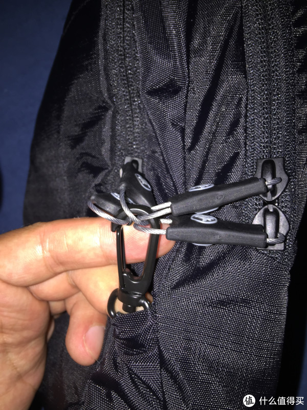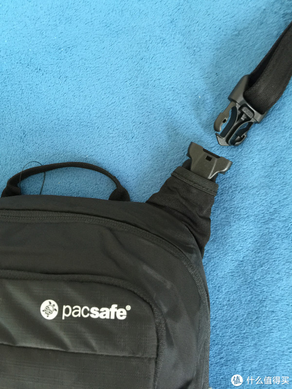 pacsafe的特色就是仿割的背带,背带的一头是双保险的挂钩,可以看到这个要用手把挂钩按下去,并按着两边才能把这个挂钩打开。另一边是固定好的,可以看到背带内含有细钢丝的,有突起,这也导致包包的背带有点硬。