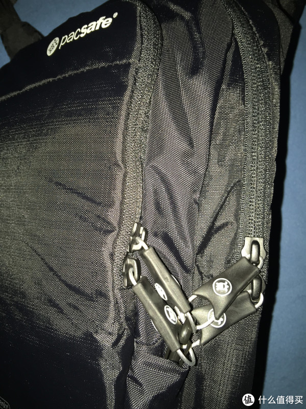 再看看细节!拉链的地方有个挂钩,可以把拉链挂在一起,有简单的防盗功能,可以防拉链被小偷拉开。这几个拉链用挂钩挂在一起的,是晚上拍的,用闪光了,色变!(天朝的小偷还用打开拉链??)