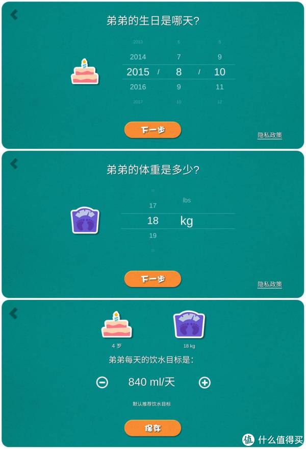 录入孩子的生日、体重,系统给出每日的饮水目标。
