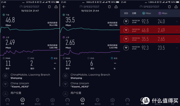当手机与小米路由器R1D接近时下载速度为46.8MB/s,上传速度为2.49MB/s。但将手机放到卧室中远离路由器时,小米路由器R1D接近时下载速度为35.5MB/s,上传速度为2.65MB/s.可见一堵墙对于小米路由器R1D的下载速度影响是非常大的,但小米路由器Mesh却丝毫没有受到影响。