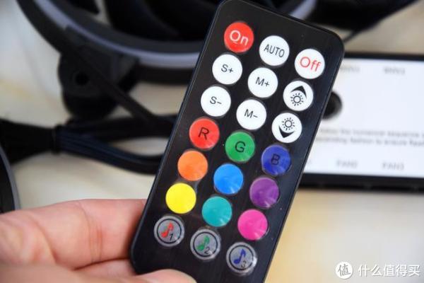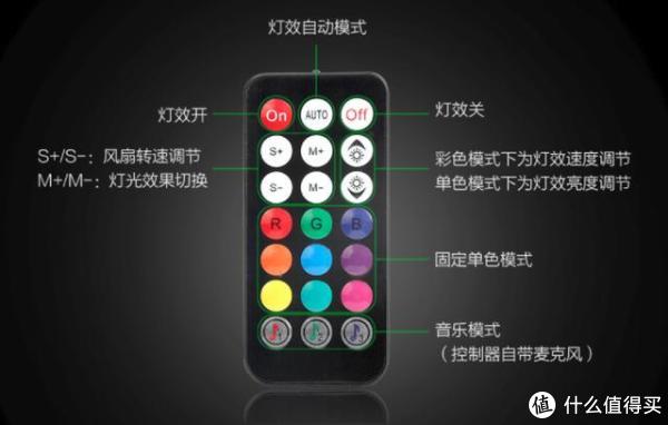 电铠ARMOR FAN 幻彩风暴风扇的无线遥控器,AUTO:灯效自动切换模式,S+/S-:灯光转动速度(共有7个转速),M+/M-:切换灯效发光模式(300种),以及亮度调节,固定单色模式、音乐模式等等.....
