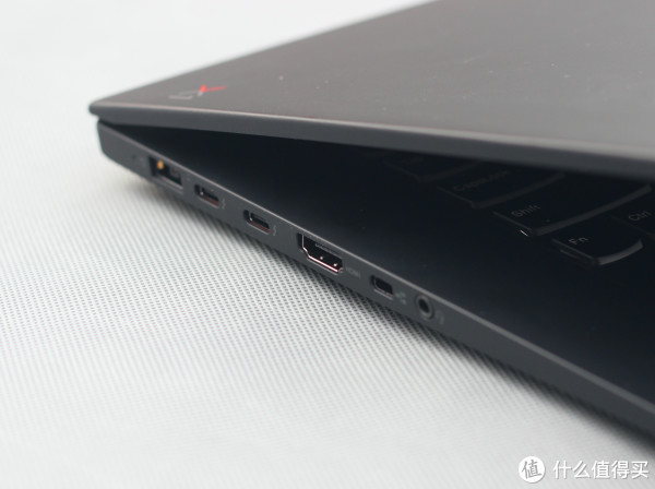 接口方面,ThinkPad X1隐士的配置还是很丰富的。在左侧拥有电源接口,雷电3接口,HDMI2.0接口。3.5mm音频接口,网线接口。雷电3接口支持多种扩展,对于接多个显示器的场景已经急不可耐。ps:官方宣传支持外接3台显示器,加上本身屏幕。4块显示屏的效果。想想就很霸气。
