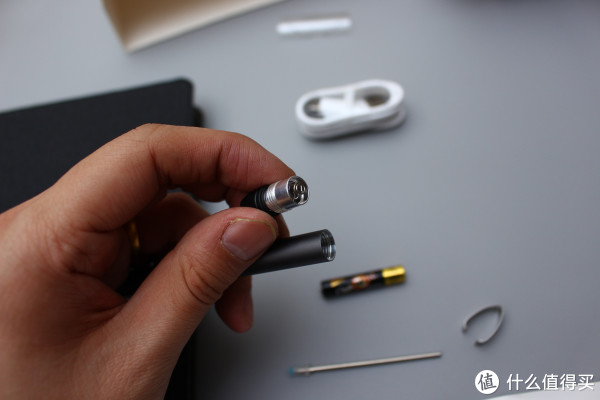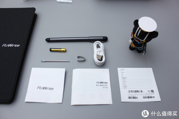 ▲这是除了智能笔记本之外的另外配件,包括了一支笔,一节9号电池,一个备用笔芯,还有一个用来拆卸笔芯的工具,和一个micro usb的充电线。还有的就是说明书和,保修卡了。