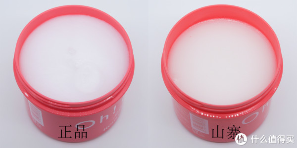 ▲膏体部分,正品的膏体清爽洁白,鼻子凑近闻没有任何一丝气味,手指按压膏体,感觉糯糯的。而山寨产品模仿不到精髓,所这里漏洞百出,山寨膏体的色泽有点偏黄,表面能看到几处比较小的气泡,鼻子凑近会有轻微的化工原料气味,用手指按压会给人一种胶体的弹性反馈。