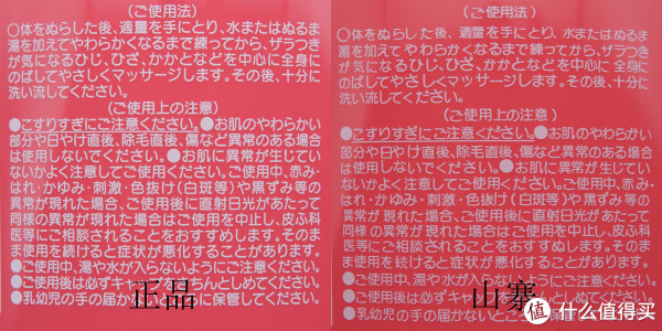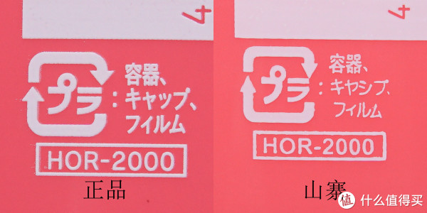 ▲进入瓶身文字印刷的对比,正品的瓶身文字印刷笔直公整,颜色亮白,所有文字的大小统一,左右对齐,间隔均匀,手指触摸文字,感觉就像摸人民币上的盲文图案一样,有强烈的凸起感。山寨平的文字印刷稍显暗淡,凸起感微弱,注意看“無着色”三个字中的“着”,“着”字下方的“目”,正品目字中的两横非常清晰,而山寨品的两横则粘到一起了。