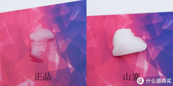 ▲取出少量膏体,使用吹风机开最高档贴近加热30秒,正品膏体会迅速融化,这也正是使用说明中所描述的,膏体接触37℃体温皮肤时,会逐渐融化。而山寨膏体就没有这个特征了,无论你用吹风机加热多久,都保持原样,没有任何变化。