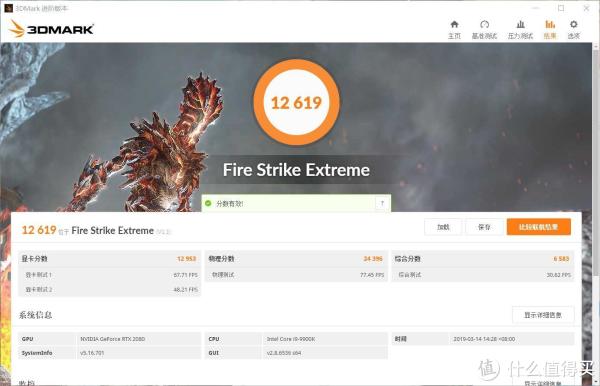 Fire Strike Extreme DX11测试分数12619分,显卡跑分12953、物理分数24396、综合分数6583