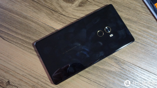 氧化锆陶瓷是一种多晶体氧化物,有一些玻璃的特性,看背面,陶瓷后壳都能媲美镜子了。小米Mix手机的正面和背面都没有MI 标志,背面有一竖排小字“MIX DESIGNED BY MI”跟盒子上的一样(这图不明显,看后面的图)。