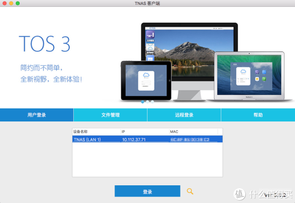 此处以MacOS桌面客户端为例进行初始化,需要说明的是由于浏览器的默认语言设置,初始化过程是英文界面,实际上后来使用过程中发现初始化过程是支持中文界面的。打开TNAS客户端,确保NAS已连接到电脑所在网络,然后设备列表里就会出现需要初始化的设备。点击“登陆”开始初始化,初始化完成之后如果再点“登陆”则会跳转到登陆页面。