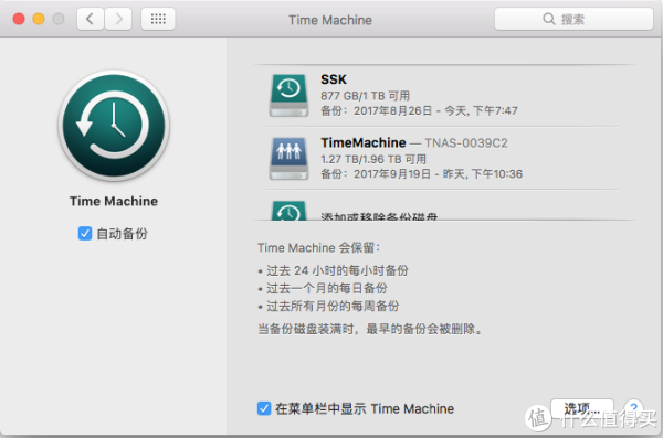 下面的示例是同时使用1T的移动硬盘“SSK”和NAS进行TimeMachine备份,系统会交替使用两个备份磁盘,后续可能把移动硬盘撤掉,只保留NAS的备份。