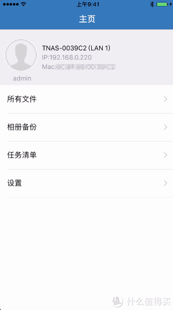 登陆之后上方会显示NAS的IP和MAC地址信息,实测即使是通过外网访问显示的也是内网IP。当前版本的TNAS Mobile一共有4个菜单——“所有文件”是一个文件浏览器、“相册备份”可用来备份手机相册、“任务清单”管理上传和下载任务,最后一个是“设置”菜单。