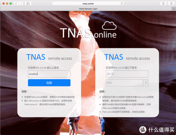 对于不知道如何配置花生壳却又有远程连接需求的初级用户,TOS提供了另外一个更方便的途径——TNAS.online。其实就是官方实现的一个动态DNS系统,启用TNAS.online功能之后,可以创建一个唯一的TNAS.online ID(截图中以smzdma为例,因为最少长度6字符),创建完TNAS.online ID之后,在访问,输入ID点击“连接”,就能远程访问NAS了,另外在本例中也可以直接访问绕过上述输入ID再跳转的步骤。对于习惯用花生壳的,如果不是在路由级别配置了花生壳,也可以在TOS级别配置花生壳。