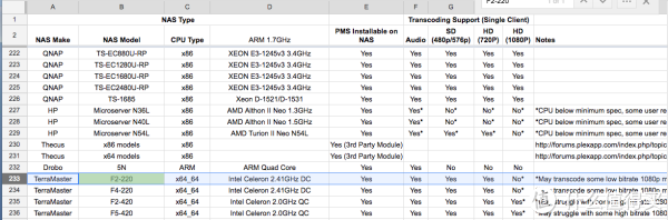 然后发现这款F2-220在我的使用场景下最大的瓶颈——CPU。按说双核2.4G的Intel CPU在同类产品中算是挺良心的配置,但是这颗CPU显然不是为高码率视频文件转码准备的。一开始是发现在使用转码的时候CPU的使用率很高,查询Plex官网发现在设备列表中本型号并不支持1080P转码,备注栏写着可能可以支持某些低比特率的1080P视频。同品牌的只有4核的型号才支持1080P转码,即使是4核的型号,备注栏还写着某些高比特率的1080P视频转码会比较吃力。