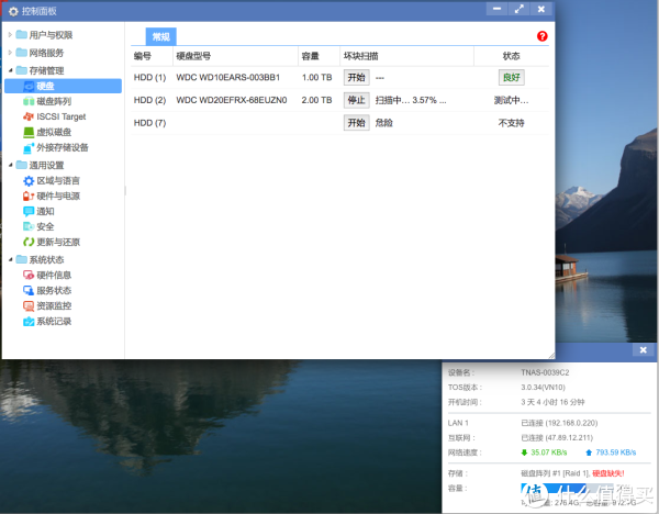 然后在控制面板APP里面把蜂鸣器关掉,进到硬盘管理界面把新插入的硬盘扫描一遍(这一步好像不是必须的),扫描硬盘耗时比较久。