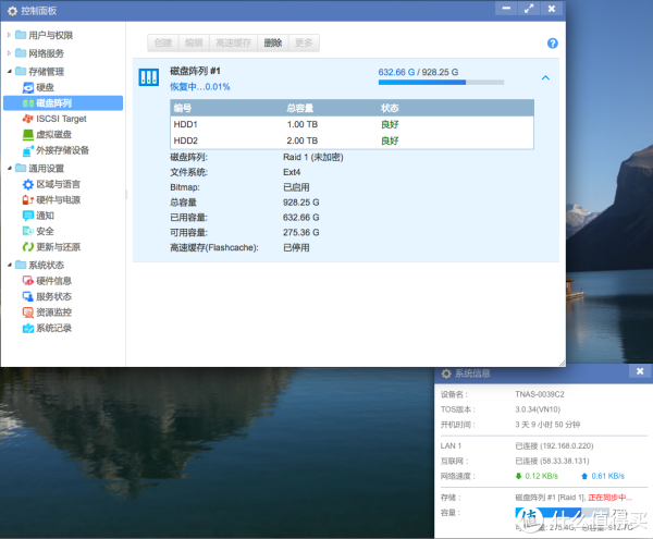 再说数据安全,有Raid1实时热备,一般来说不太会出现状况。一旦有检测到异常,实时的邮件提醒和蜂鸣声也能及时通知到。断电恢复通电自开机保证了更可靠的在线时间。