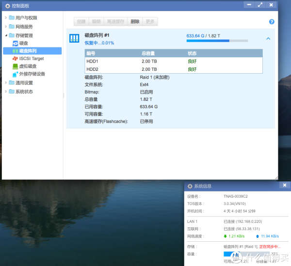至于有人说西数红盘容易挂之类的,反正狗东3年质保,只要另一块硬盘不同时挂就行了,Raid1不就是防硬盘挂的么?然后说容量,其实我家iMac硬盘也就1T,剩余空间50%以上,所以2T的NAS对我来说够用了,不够用以后再换硬盘喽,这不已经换过一次了么。过程相当容易,就是花点时间重建Raid而已。而且通过外接移动硬盘,NAS的实际容量其实已经是3T了——2T的RAID1用来存放相对重要的数据,1T的移动硬盘用来下载电影什么的,上面测速结果移动硬盘的读写速度也在40MB/s以上了,用起来跟内置硬盘没多大区别。