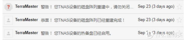 回到正题Raid1扩容,操作起来很简单,都不用关机,直接拔掉一块硬盘,再装回一块新硬盘,硬件扩容完毕。几乎在拔掉硬盘的同时,NAS开始发出持续的蜂鸣声,跟电脑主板的报错声音类似,同时之前设定的邮箱会收到通知邮件。