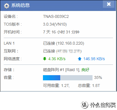 正如你在标题中看到的,使用F2-220一星期多,最大的感受是它是一个默默无闻、值得信赖的数据仓库。基本上属于一次性配置好就丢那儿再也不用去管,所谓“即插即忘”型。下面的状态信息是家里停电之后恢复供电时NAS自动开机一直运行到现在的状态,开机时间7天16小时,期间我还在机器运行中换了2块硬盘。7x24小时工作的产品,如果能够做到“即插即忘”,个人认为就是一款好的产品。