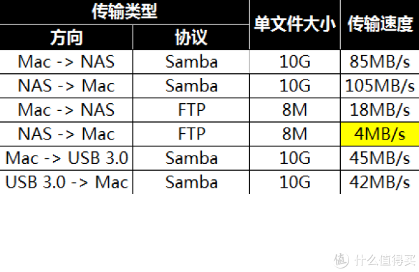 说起NAS很多人会关心它的数据吞吐能力,毕竟能存得下大数据还得方便快速存取。但是传输速度这事,跟太多因素相关。网络连接速度、共享协议、两端的硬盘读写速度、单文件大小、杀毒软件实时扫描等,都会影响最终的数据传输速度。因此这里做的实验只是给大家一个大概印象。本例中使用2012年末的高配iMac,NAS里面一块2T的西数红盘、一块2T的希捷酷狼组成Raid1,都是通过千兆有线连接到路由器。另外NAS端USB 3.0接口连接了一块1T的移动硬盘(见下方卡片)。主要共享协议是Samba和FTP。