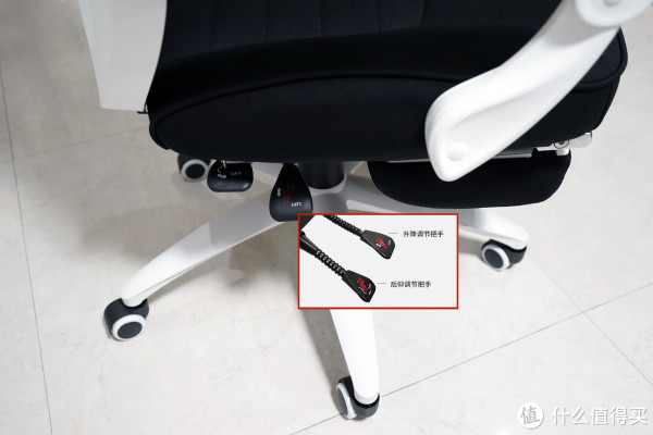 ?最后要说下安装好的电脑椅的底盘,采用了加厚钢材的底座,它的防爆耐用承受能力提升很大,底盘上的调节把手左边的为后仰调节把手,右边的是升降调节把手,调节把手设置了高度的调整以及后躺模式,可以根据需要进行调整。如图上所示!字面上也比较好理解!