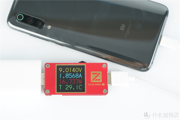 使用QC充电器+酷派数据线充小米9手机,电压9.04V,电流1.85A,功率16.73W,可开启QC快充。