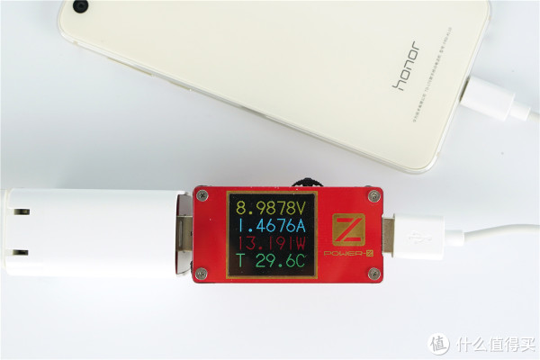 使用支持FCP快充的充电器+酷派数据线充荣耀8手机,电压8.98V,电流1.46A,功率13.19W,可开启FCP快充。