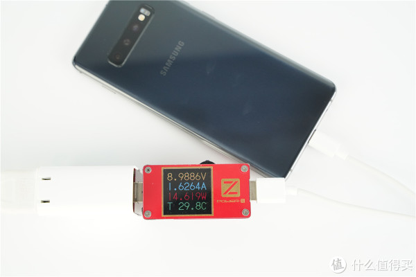 使用支持AFC快充的充电器+酷派数据线充三星S10+手机,电压8.98V,电流1.62A,功率14.61W,可开启AFC快充。