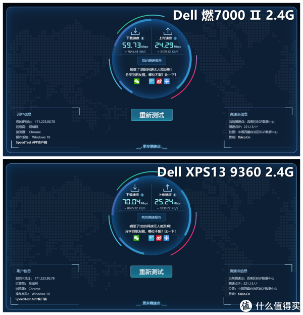 表现在网络速率上,我进行了五轮测试,取其最高值,从下图可以看出,XPS13 9360和燃7000 Ⅱ网速接近,差距不大。