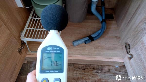 如果打开水槽下的柜门,噪音测试仪靠近一些,声音在74.6分贝左右,短时间的话,还算能接受的范围,当然基本上我们使用的时候,还是关闭着柜门的