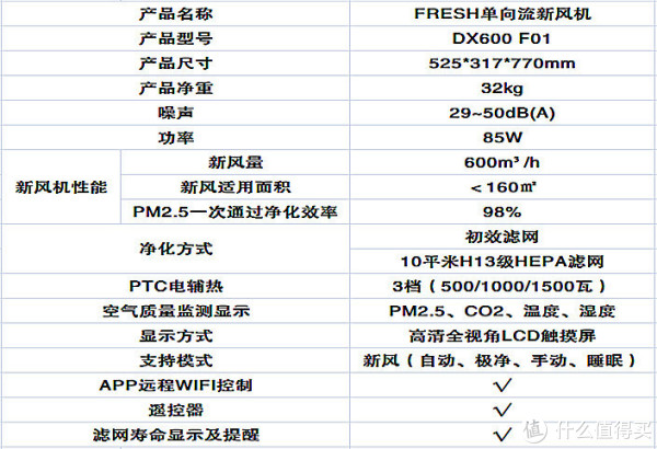 从官方公布的产品参数及相关性能来说,DX600 F01无论是在产品外观尺寸,还是在功率(风机或电辅热)、风量、滤网面积和噪声等性能方面,以及显示和控制方式的丰富性和智能型等方面,都处于同类产品的领先地位,为它下一步的优秀工作表现提供了保证。具体见下表: