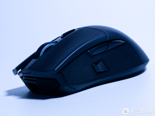 左侧有3个可分配按键,默认是上一页、下一页和DPI锁定功能,我们也可以根据需要自行设定。侧面中间凸起的按钮华硕称之为狙击按钮,用来提供射击准确度。原理是按住后DPI会降低,让你能更精确的进行瞄准。不过我好久没玩FPS游戏了,这功能用不上: