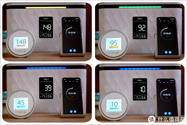 首先使用净化器的自动模式进行净化效果测试,自动模式应该也是日常生活中大家最常用的,初始PM2.5值为500,开机后净化器自动启用最大风档,经过2分钟后,室内PM2.5值降为148,空气质量指示灯变为黄色,表示空气质状况为轻度污染;运行3分钟后,室内PM2.5值迅速降为92,空气质量指示灯变为绿色,室内空气质量变为良;运行5分后,室内PM2.5值降为39,空气质量指示灯变为蓝色,室内空气质量达到了优,此时净化器已经处于1档风速运行,基本上感觉不到运行噪音了;净化器在连续运行了10分钟后,室内PM2.5值降为10以下。