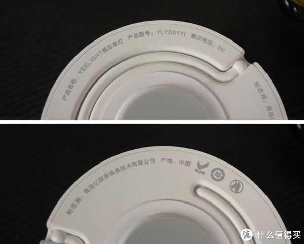 ▼夜灯底部四周印有的产品标识,以及制造商、产地。