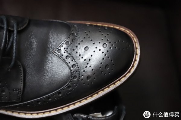 ▼翼尖型拷花是较为常见的雕花类型,雕花打孔细致,走线工整。可正装可休闲,搭配风格广泛,比传统的正装鞋子多出了细节和个性。