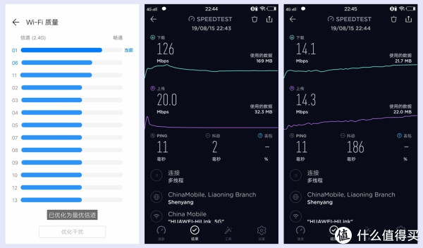 家中网络带宽为200M,在测试带宽采用了一款名为“SPEED TEST”的APP,为了保证网速达标,使用一键体检做了网络优化,优化后将信道01作为了最优信道。此时连接2.4GHz测试下载可达到14.1Mbps,上传14.3Mbps;连接5GHz的下载速率为126Mbps,上传为20Mbps。