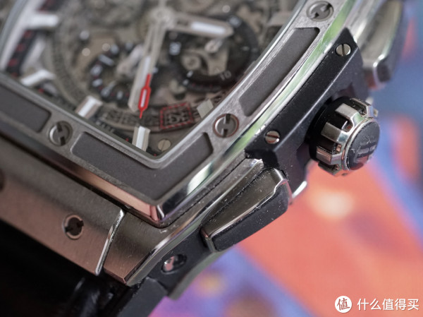 细看之下,还是能找到很多不同之处,如宇舶最具代表的H型螺丝(是真的要拧进去的,而其他某品牌,大家懂得·····),表壳主体为钛金属材质,透明蓝宝石盘面显露出裸露的机芯,整体混为一体,强烈的金属质感,外加立体多层次的元素组合,显得时尚高科技。