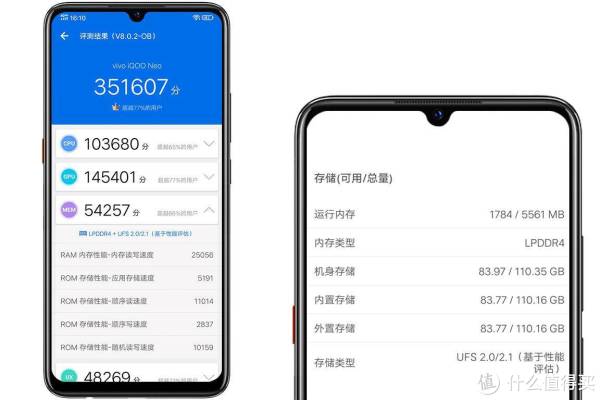 安兔兔测试中,iQOO Neo的存储得分超过5.4万分,其中又详细划分了存储各类读取的速度得分。