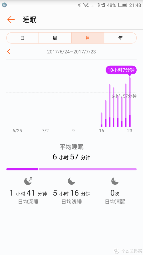 ▲我买手环的初衷,就是监测睡眠,这段时间睡眠还不错了,平均能有近7小时睡眠,接近2小时的深度入睡,不过我要说,我都是靠周末来补瞌睡的好么,比如今天就睡了10个小时……真心觉得有点累。