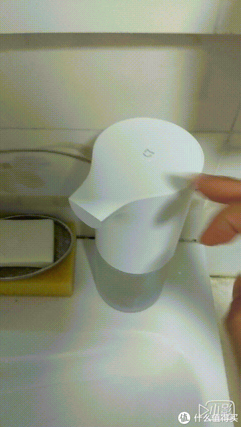 使用时轻触顶部米家标志,白灯亮2秒即为开机,此时用手靠近机身立即感应出泡,实际使用中机器感应非常迅速,没有感觉到延迟,与产品宣传的极速出泡相符。