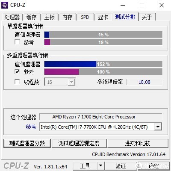 8核1700拳打脚踢踩4核7700K问题不大,单核145cb,都快可以跳起来打家里那颗笔记本那颗U的膝盖了。本来也没指望打游戏多厉害,主要用途还是运行PR,AE之类的娱乐软件。