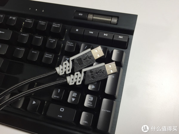 在键盘连接线位置旁设置USB拓展口,可满足日常的USB使用功能,比如:充电,鼠标/耳机/麦克风连接,实用性能比较强,但前提需要将键盘连接线的两个端口全部连接PC上面,才能生效。如下图所示的键盘连接线端口。