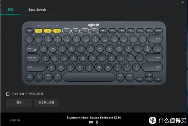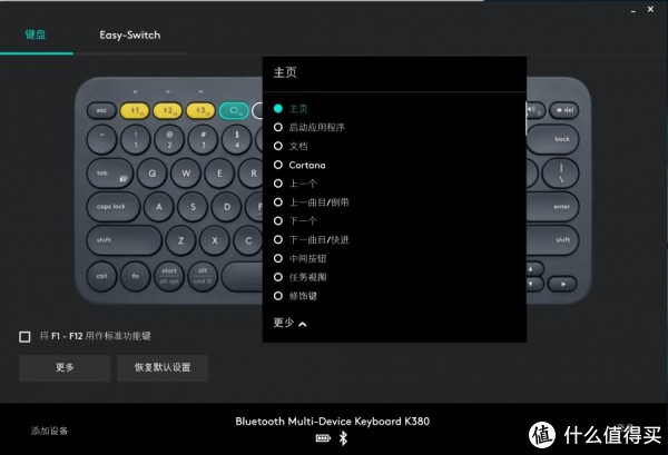 此外,K380还可以通过Logitech Options来根据自己的需求自定义按键功能,打开Logitech Options,主界面上将会显现全部与K380连接过的设备,并在此列表中可以进行具体化调整。