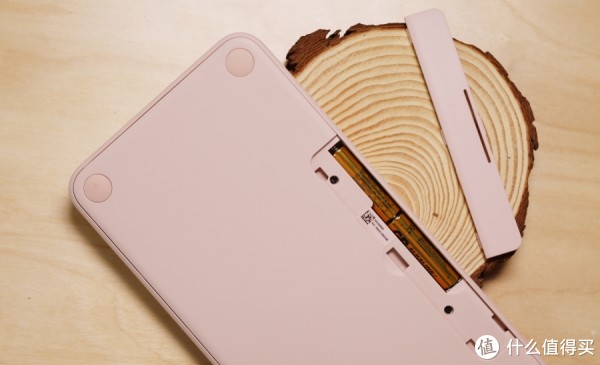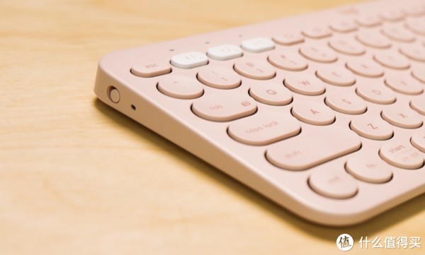 整个机身采用工程塑料材质,加入哑光设计,在键盘正面上方居中位置以及背部最下放分别印有罗技和K380的logo。不过,虽然机身采用哑光磨砂面设计,但还是会有一定概率留下指纹,不过好在我手中的K380是茱萸粉配色,颜色较浅,指纹痕迹也就不那么明显。如果是像黑色或者是蓝色这样较深的配色,可能就需要用户定期清理来保持洁净了。