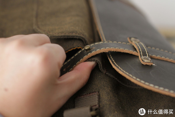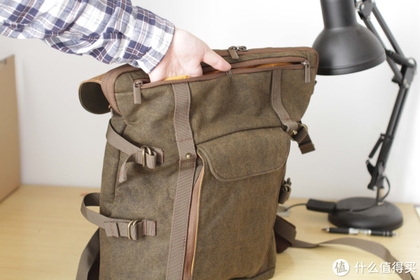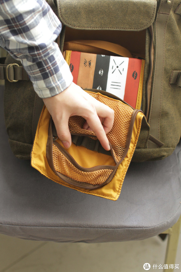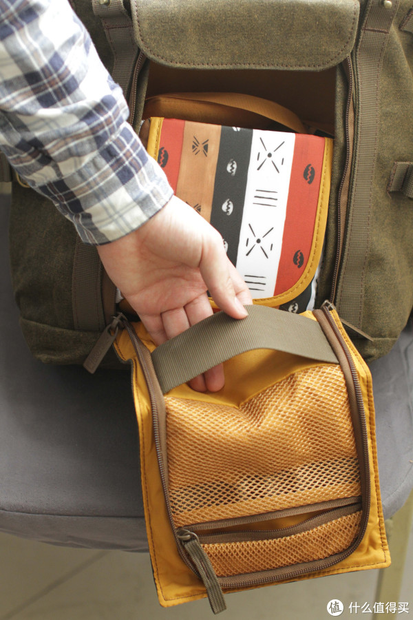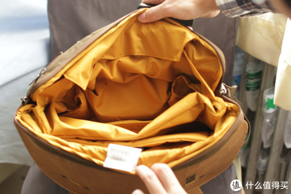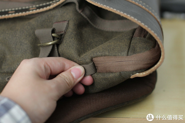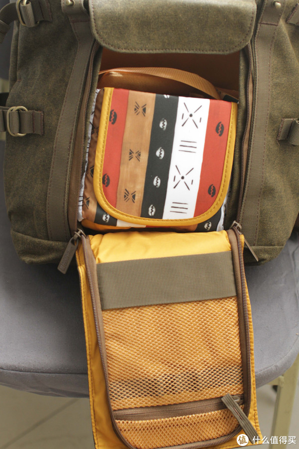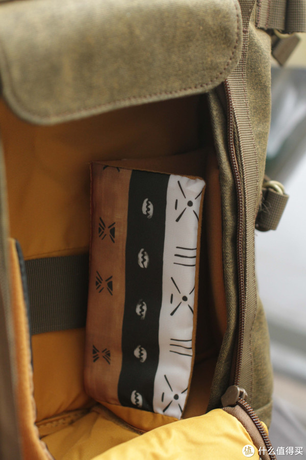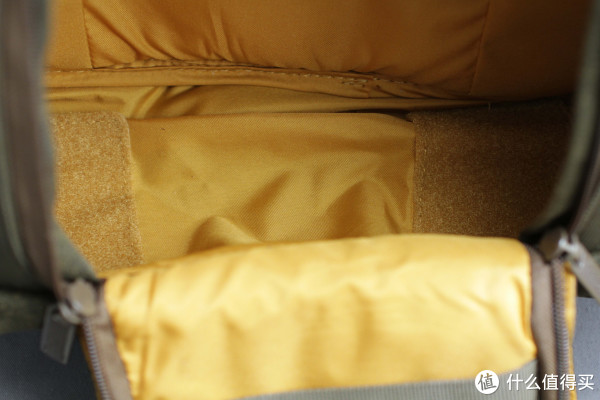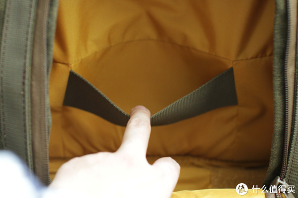 把这个袋子可以卷起来翻到后面,然后再用下图我手指指着的魔术贴固定好,这样整个包就贯通了,可以当做日常使用的背包。