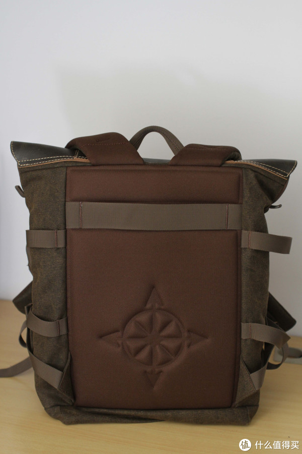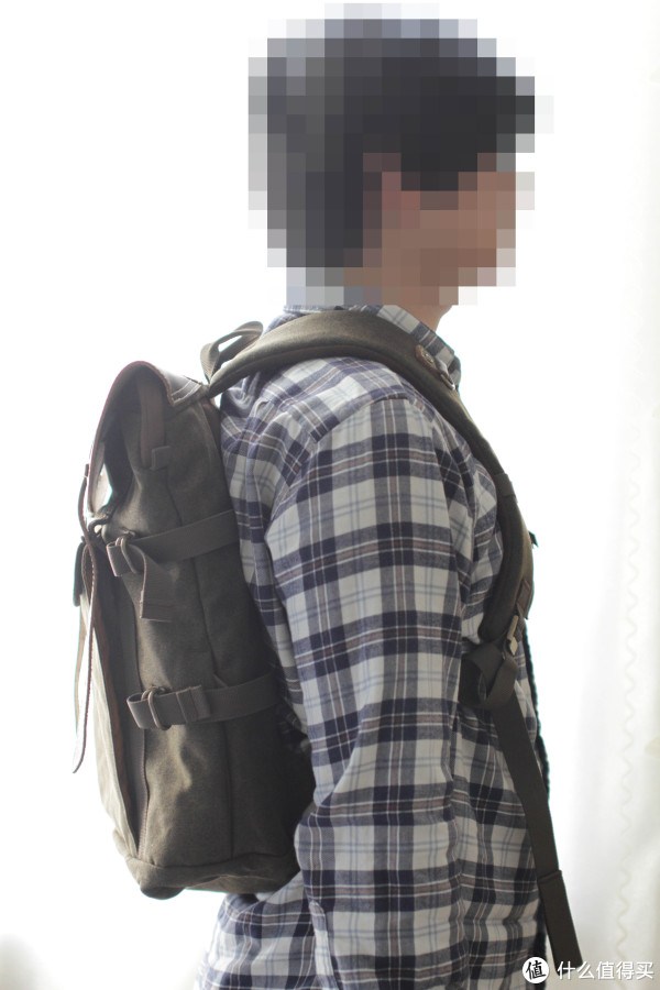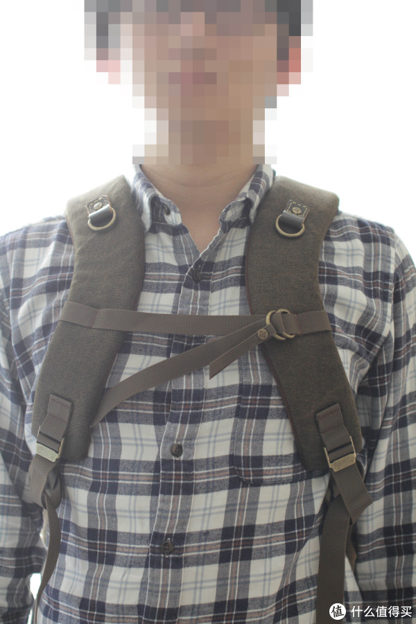 这是我背着比较舒服的状态,重量都集中在整条厚厚的背带上,没有完全在肩部。当然背带的距离有些太近了,以后慢慢调整吧。